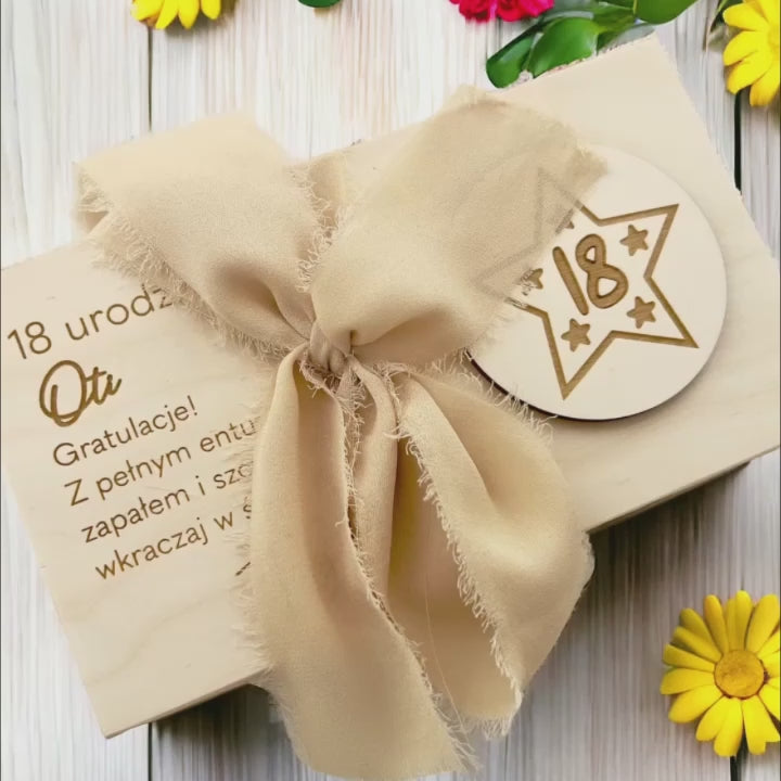 Eleganckie drewniane pudełko na pieniądze na 18 urodziny to wyjątkowy sposób na wręczenie gotówki w formie, która zostaje z solenizantem na lata. Naturalne drewno, precyzyjny grawer i dekoracyjna wstążka tworzą gotowy prezent – bez potrzeby dodatkowego opakowania.